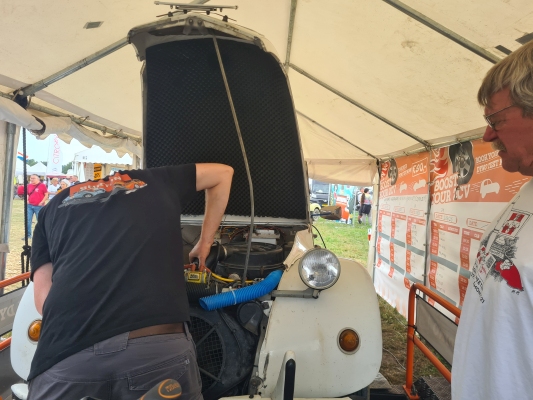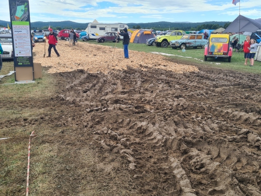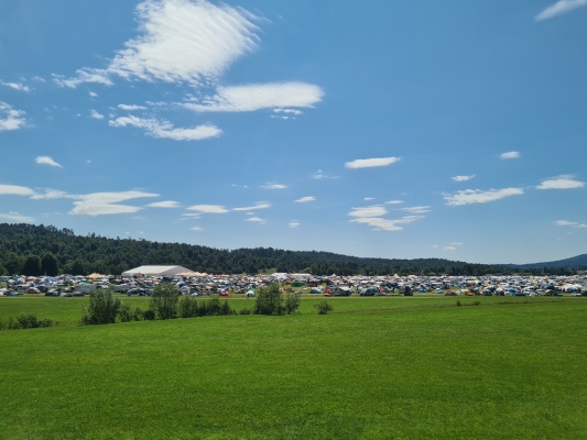Und etwas später wissen wir: Schuld an der Verspätung der Camp-Eröffnung ist der Regen. Der hat den Boden dermassen aufgeweicht, dass an ein Durchkommen „der grossen Masse“ nicht mehr zu denken war. Es galt, zuerst die vordefinierten Wege auf dem riesigen Feld mit Holzschnitzeln wieder halbwegs befahrbar zu machen. Und viel später wissen wir auch: Es waren davon 880 m3 nötig. Nun ja, immerhin ging es darum dafür zu sorgen, dass rund 2800 Fahrzeuge nicht im Schlamm steckenblieben.