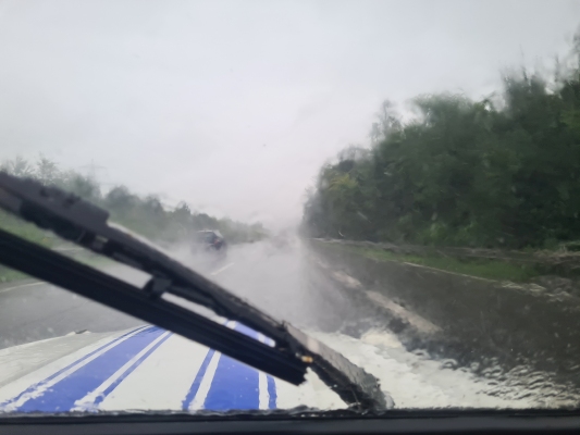 Ganz wichtiges Detail: Es regnet. In Strömen. Und wir warten geduldig, dass sich die Tore in unser relativ kurzfristig geplantes Abenteuer endlich öffnen. Doch das dauert. Es tut sich nichts. Aber wir sind in guter Gesellschaft – mehrere hundert unserer Sorte stehen ebenfalls da und warten. Irgendwann wird es einem zu bunt und er fängt an zu hupen. Der Nachbar lässt sich nicht lange bitten und hupt ebenfalls. Das wirkt ansteckend und bald ertönt ein grandioses Hupkonzert. Leider ohne Erfolg – wir warten weiter. Die offizielle Öffnungszeit (10.00 Uhr) ist längst vorbei; die Mittagspause auch. Mittlerweile hat der Regen nachgelassen und plötzlich sehen wir sie: Lastwagen, die tonnenweise Holzschnitzel herankarren.